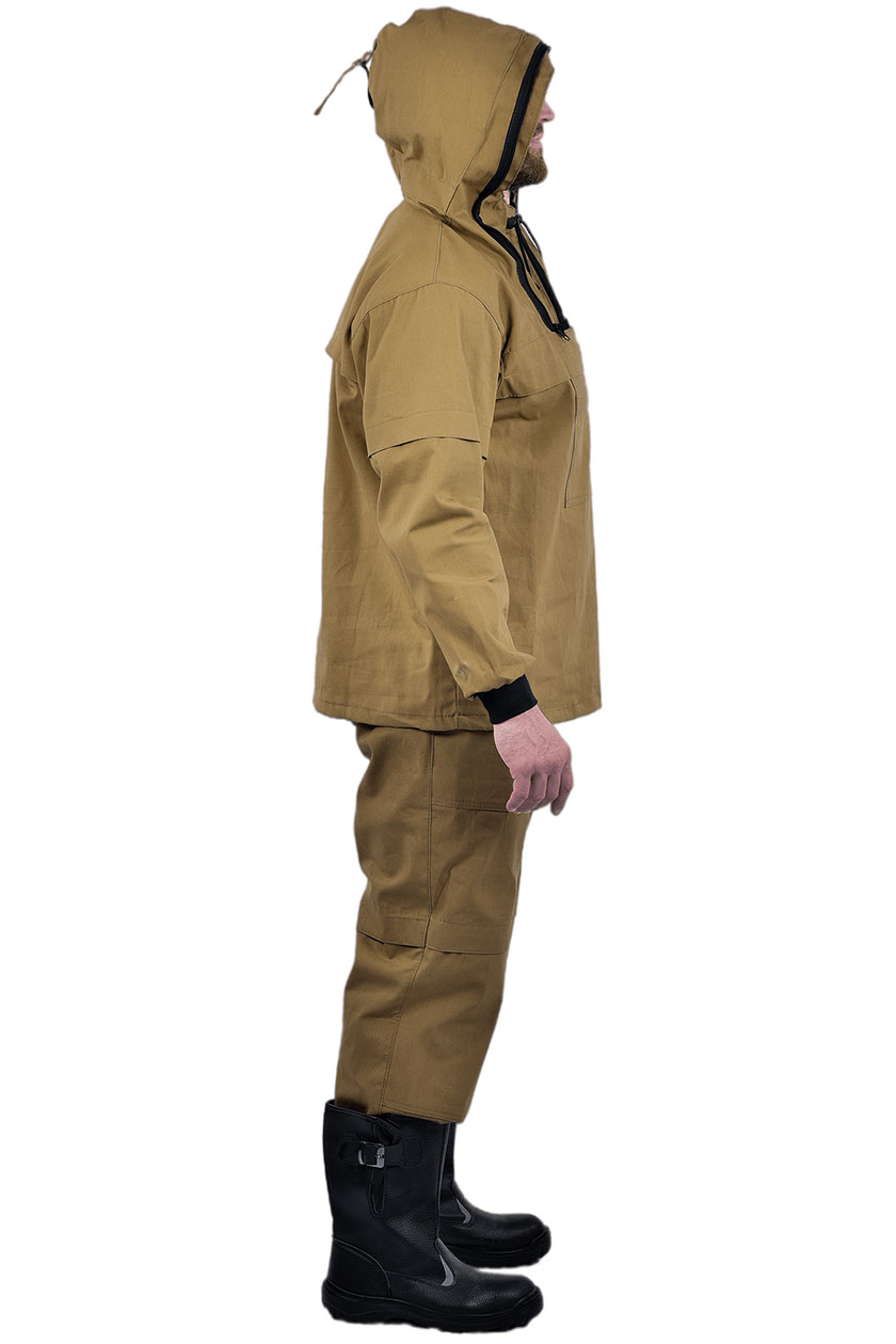 ➠ Куртка прямого силуэта с отрезными кокетками полочки, с капюшоном сложной конструкции, исключающей проникновение насекомых под одежду. Капюшон с противомоскитной сеткой. Низ куртки стягивается эластичным шнуром с фиксатором. Рукава втачные, с трикотажными манжетами-напульсниками.